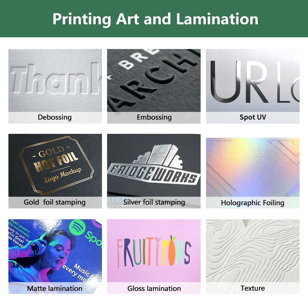 | Feature | Matt Lamination, Glossy Lamination, Glossy Oil Varnish, Velvet Lamination, Anti-Scratch Lamination, Laser Lamination, Degradable Lamination |