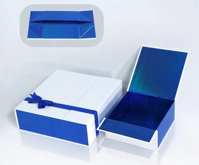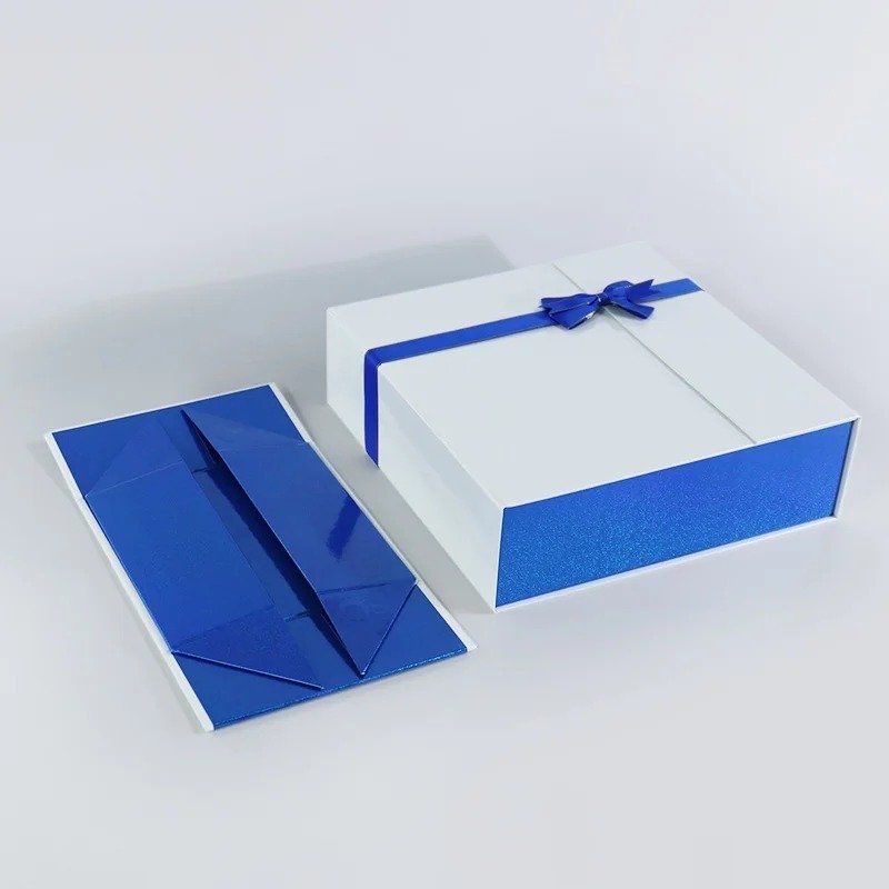 This folding gift box features a minimalist design characterized by a pure white exterior contrasted by a simple blue bowknot accent. The interior and side panels are lined with blue pearl paper, providing an elegant, professional image that subtly enhances brand identity. The box body is constructed from sturdy, durable cardboard with an exterior glossy film to ensure the gift is perfectly protected. The box is a versatile Cardboard Rigid/Folding type, ideal for high-end Cosmetics, Perfume, and Jewelry. Material options include rigid paperboard up to $1800\text{gsm}$ thick, with full customization of logo, size, and design. A comprehensive range of printing and surface finishing options are available, including CMYK, Foil Printing, Stamping, Embossing, and various laminations (Matt, Glossy, Velvet). Samples are quickly available within $1-3$ days, with a production lead time of $7-12$ days.